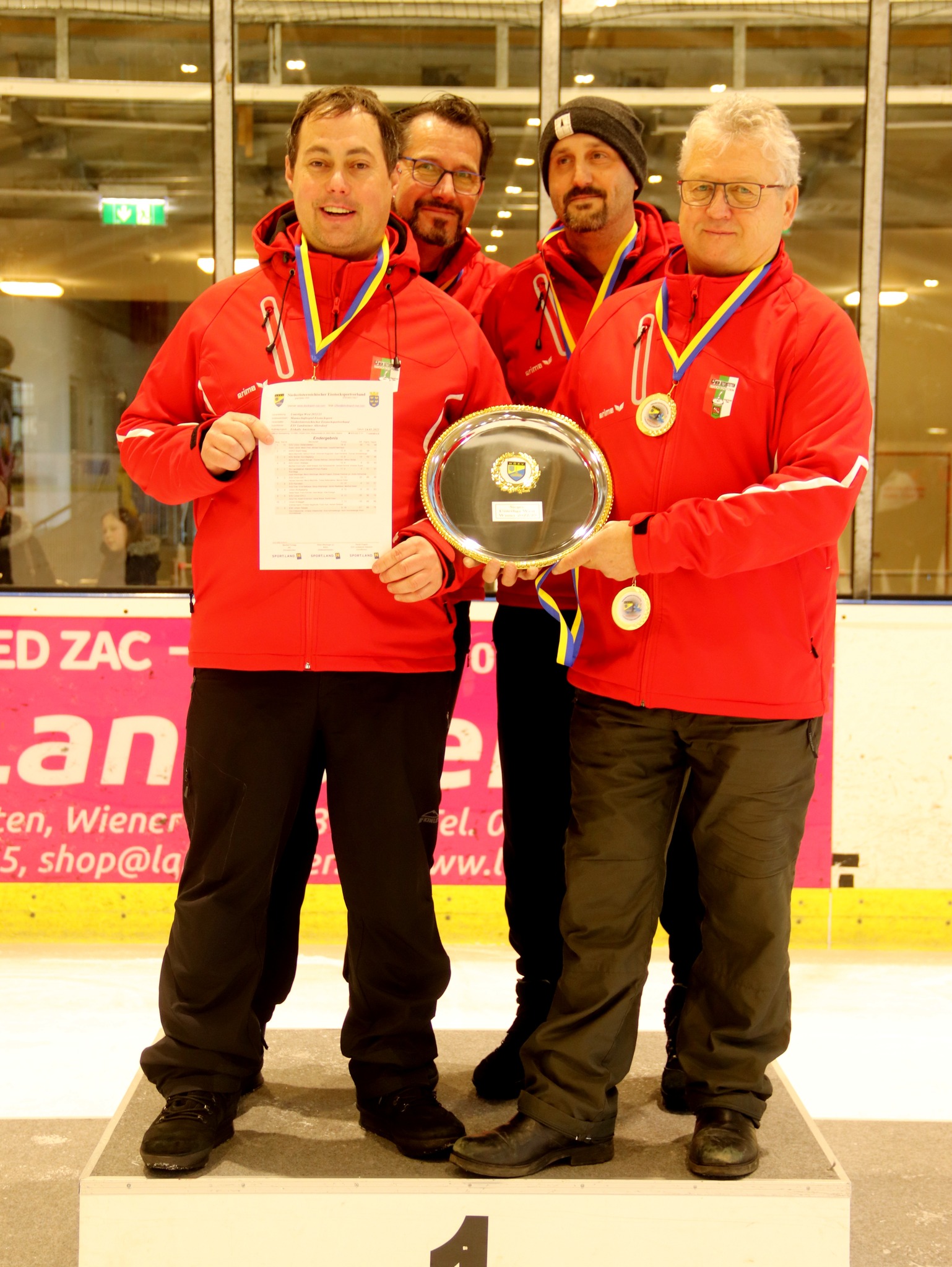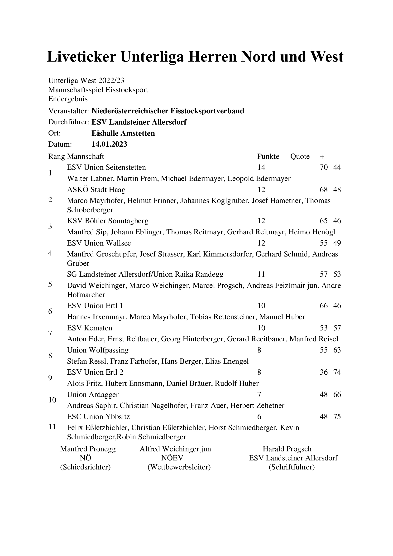 Am 14. Jänner wurde die Unterliga-West in der Eishalle Amstetten ausgetragen. Unser Verein trat mit den Schützen Michael & Leopold Edermayer, Walter Labner , Martin Prem an. Mit einen knapp verlorenen Spiel startete unsere Mannschaft in die Meisterschaft, konnten sich aber im laufe des Turniers von Spiel zu Spiel steigern. Glücklicher weise stand schon in den letzten Spielen fest, dass der Aufstieg unserer Mannschaft in die nächste Liga ( 2.Landesliga) geglückt war. Zur großen Freude sorgte am Schluss noch der 1.Platz in der Meisterschaft!