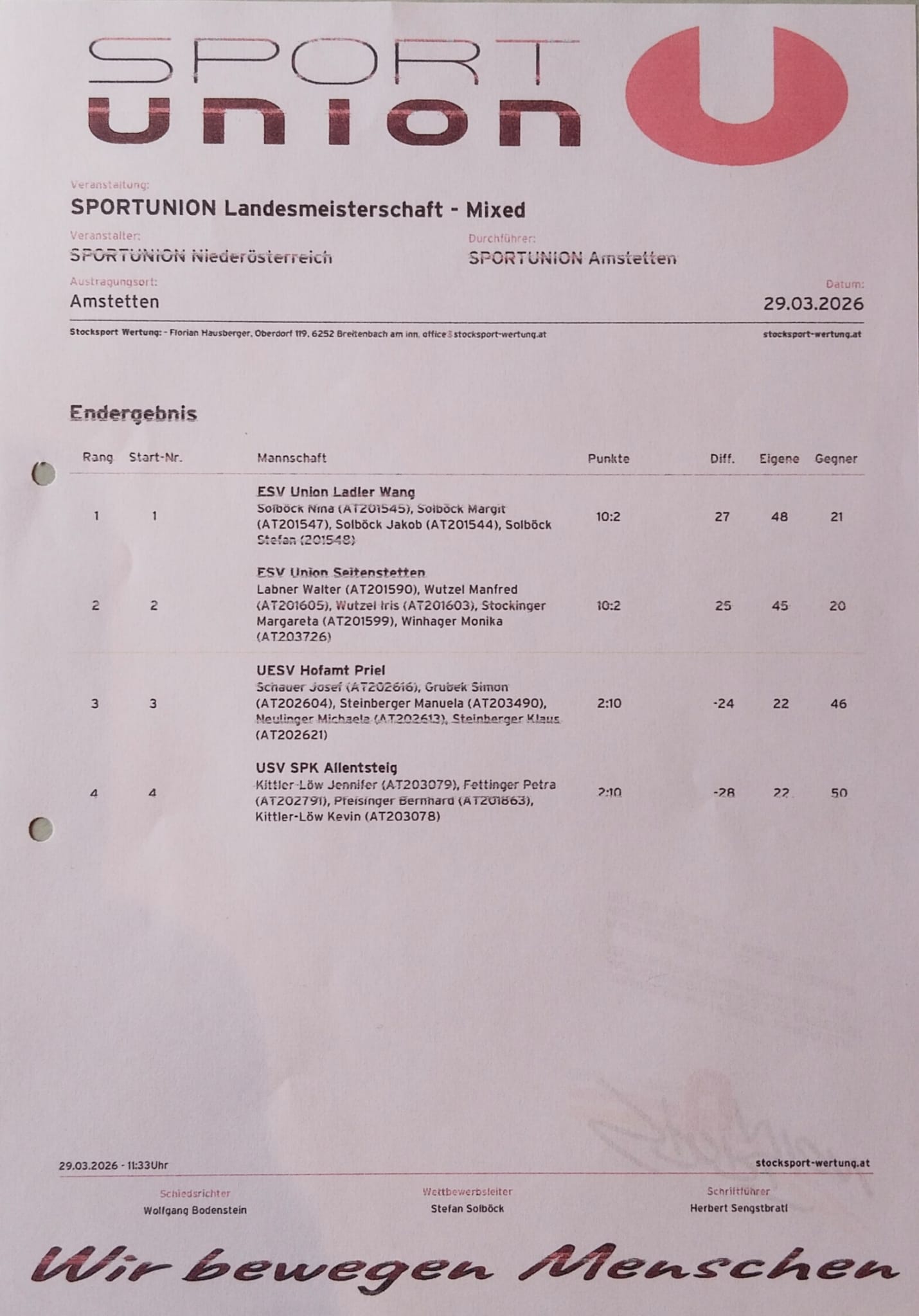 Am 29. März fand in der Stocksporthalle der Union Amstetten die Union-Landesmeisterschaft Mixed statt. Das Starterfeld war mit lediglich vier Mannschaften leider überschaubar. Für unseren Verein gingen Margareta Stockinger, Iris Wutzel, Monika Windhager, Manfred Wutzel und Walter Labner an den Start. Der Bewerb wurde in zwei Durchgängen ausgetragen. Unsere Mannschaft überzeugte mit einer konstant starken Leistung und erreichte punktegleich mit dem Siegerteam den hervorragenden zweiten Platz. Ausschlaggebend für die Platzierung war letztlich die etwas schwächere Differenz. Mit dieser Platzierung ist die Mannschaft für die BM an Mondsee startberechtigt.
